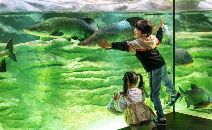 世界最大級の淡水魚・ピラルク。体長4m超、体重200kgにも達するその姿はまさに圧巻! 1億年以上前から姿を変えていない“生きた化石”としても知られています。