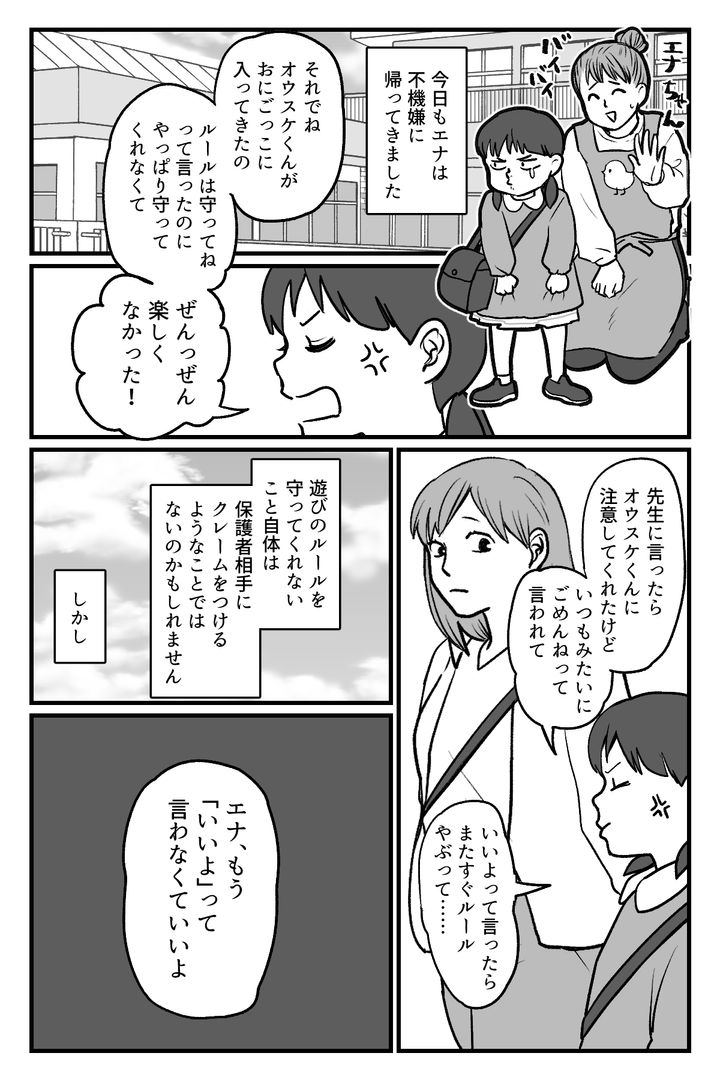 私は30代の主婦です。幼稚園に通う次女のエナはお友達のオウスケくんにいじめられたと言って、よく泣いています。オウスケくんは同じ幼稚園に通う男の子です。他のお友達にも意地悪をしたり、遊具を独り占めしたりと困った行動をよくしているのです。私もこの光景をよく見るので、内心では「またあの子か」という気持ちになります。オウスケくんは先生に注意されると素直に謝ってくるので、許さないといけない雰囲気になるのがエナにとってストレスな様子……。今日も迎えに行くと、エナは不機嫌に帰ってきました。一緒に遊んだときにルールを守ってくれないので、オウスケくんと遊ぶのを断ったところ、エナが先生に注意されたようです。