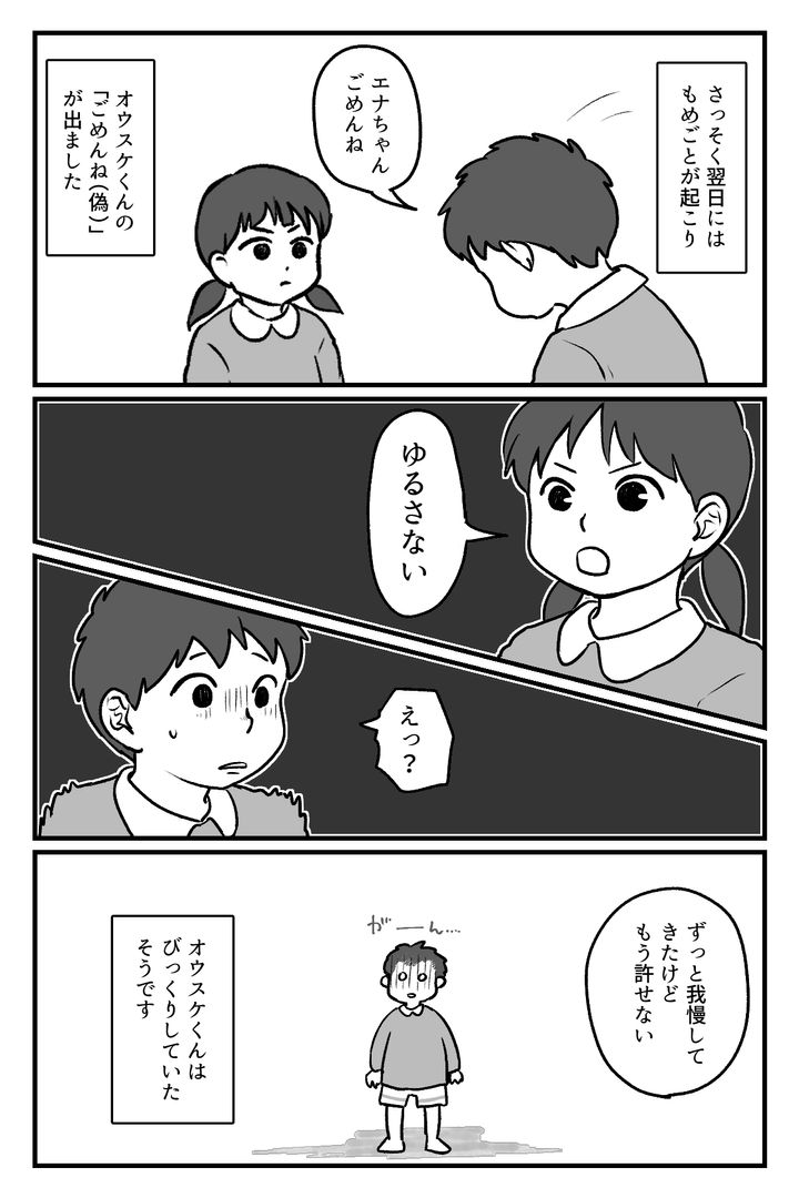 オウスケくんがくりかえす意地悪にとうとう我慢の限界を迎えたエナ。謝ってきても許さない、許すか許さないかは自分の気持ちで決めるという対応を実行したようです。反省の気持ちがない謝罪や、納得していないのに相手を許すという形だけのやりとりは意味がないと思います。エナだけでなく、オウスケくんにも今回の出来事を通して良い変化があれば……と願います。