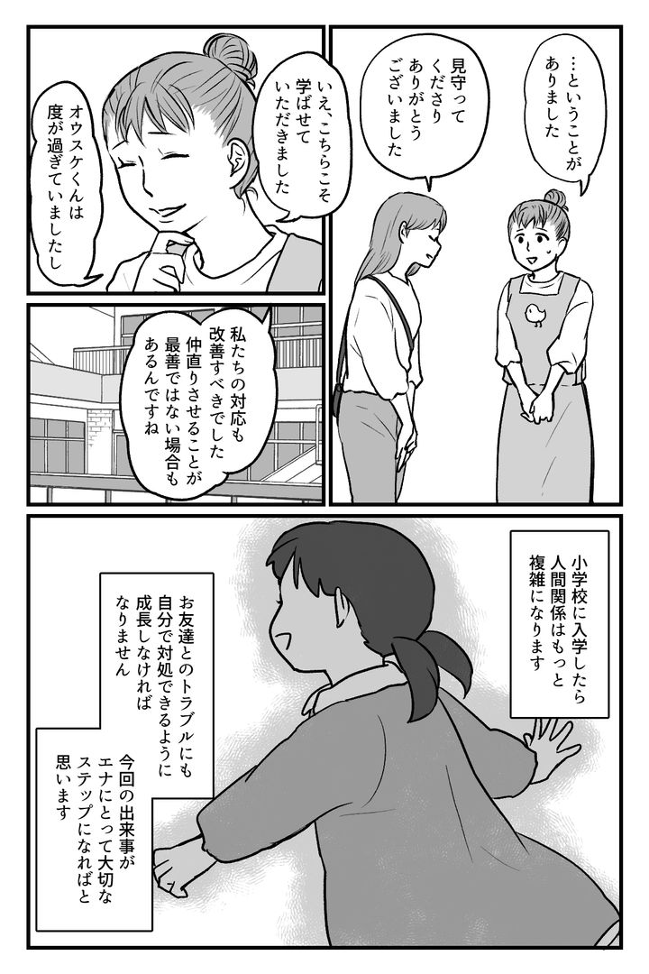 小学校に入学したら人間関係はもっと複雑になります。お友達とのトラブルも自分で対処できるように成長しなければなりません。今回の出来事がエナにとって大切なステップになればと思います。
