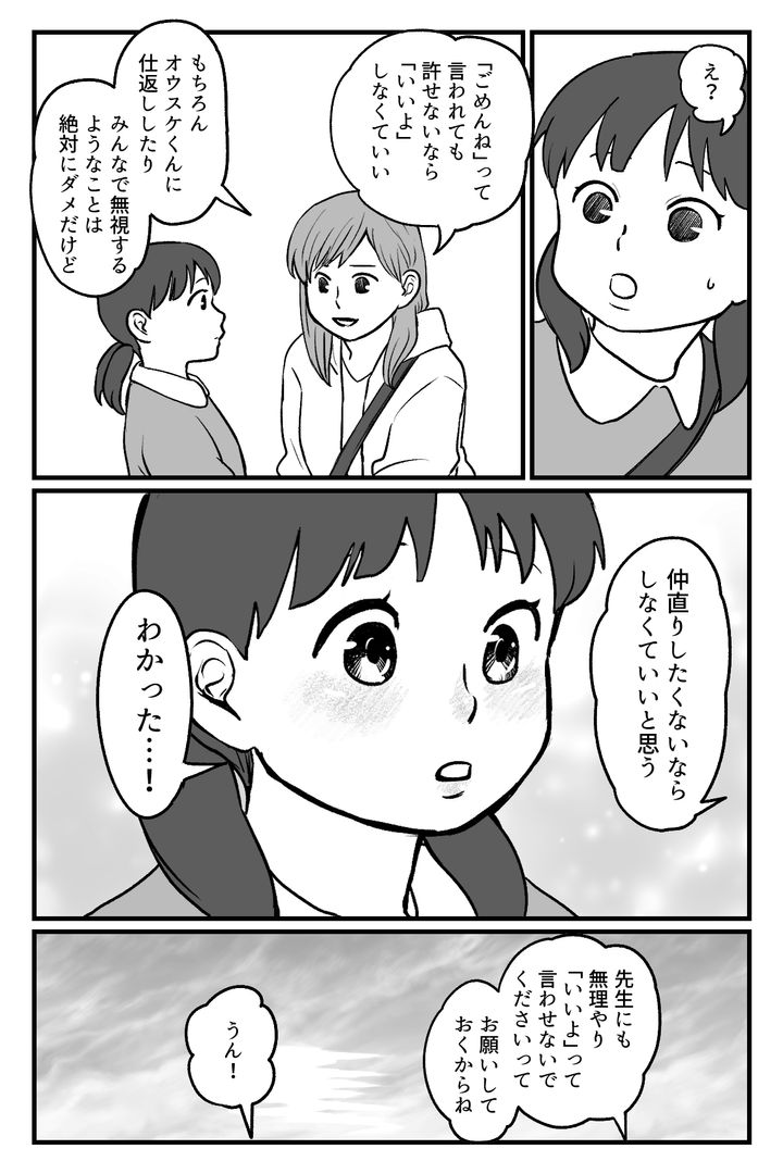 意地悪をくりかえしても謝れば許してくれるんでしょ? という態度のオウスケくん。そんなことのくりかえしにストレスを溜めているエナに「もう『ごめんね』って言われても、許せないなら『いいよ』と言わなくてもいい」と伝えました。