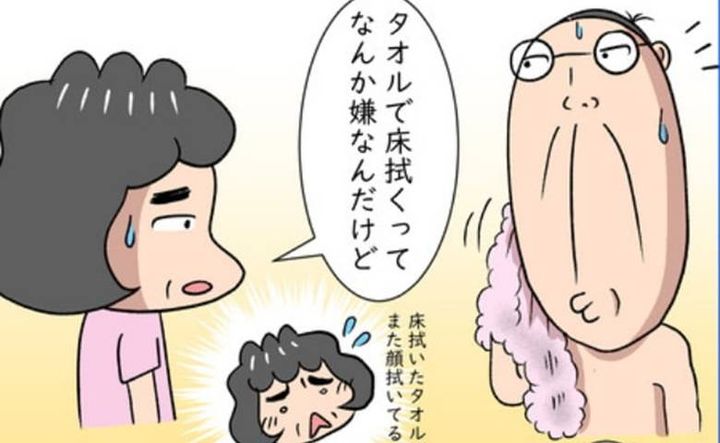 3. 「え?」バスタオルで床拭きする夫。嫌だと伝えたら夫が予想外の発言<熟年夫婦ライフ>
