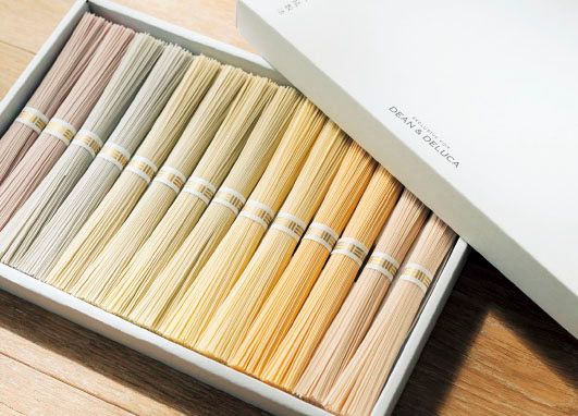 紅紫蘇、トマト、生姜、よもぎ、青紫蘇、ブルーベリー、紫芋の食材の色味を活かして、ひと束ひと束丁寧に作られた手延べ素麵。七つの味わいが楽しめるのも魅力。夏の食卓を美しく彩る。14束入り¥3,240