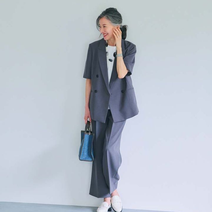 ジャケット¥24,970、パンツ¥19,910/ともにアンクレイヴ、Tシャツ¥8,800/ノーク、バッグ¥55,000/ア ヴァケーション(ノーベルバ)、ローファー¥23,980/タラントン by ダイアナ(ダイアナ 銀座本店)、ピアス¥44,420、リング¥20,680/ともにバルブス(ズット ホリック)、ネックレス¥24,200/アビステ、時計¥13,200/カシオ クラシック(カシオ計算機 お客様相談室)