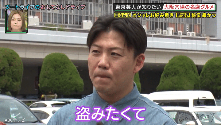 商魂を燃やすおたけは、「もんじゃは自信があるんだけど、ちょっとお好み焼きがおいしくなくて……自分的には。お客さんは満足してくれているらしいけど。やっぱ大阪の本場のお好み焼きを盗みたい」と思っている。大阪のお好み焼き店は味だけでなく、「看板とかめっちゃいい」「雰囲気がやっぱ東京と違う」らしく、大阪のお好み焼きに関するあらゆることを「盗みたい」とおたけは何度も語った。