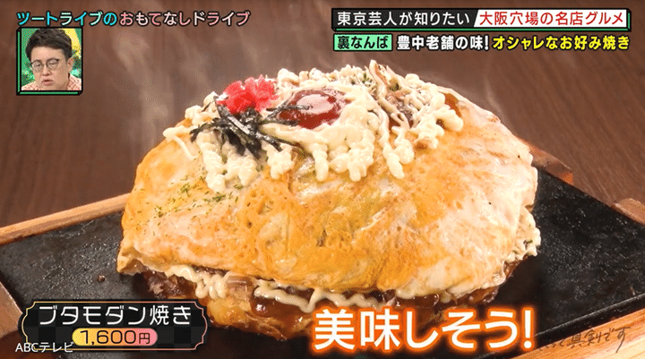 おたけは、ブタモダン焼きの提供方法に、「今まで見たことがないタイプ!」とビックリ。試食すると、「マジで軽っ! これおいし~!」「俺らが知っているジャンルのはずなのに、俺らが知らないコクとか厚みがある!」などとうなりまくった。あまりにもおいしかったために、「これ、レシピはありますか?」と店のマネージャーにたずね、味を盗む気満々だった。
