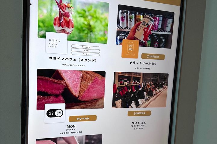 写真はエレベーターを降りたところにあるサイネージで、このフードホールに入っているお店が紹介されています。