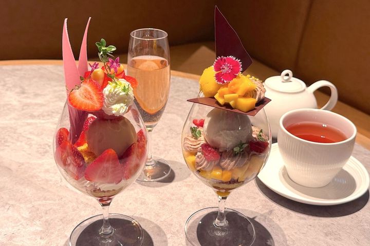 メニューは月替わりで変わるそうですが、取材時には「苺とショートケーキのパフェ」2180円(写真・左)、「マンゴーとショコラのパフェ」2380円(写真・右)でした。