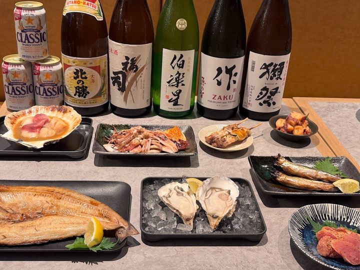 「羅臼産開きほっけ焼き」1490円、「厚岸産真牡蠣 ナガえもん」1個490円、「野付産ほたて北寄バター醤油焼き」、「羅臼産いか一夜干し焼き」など、日本酒と相性のいいメニューが目白押し。(メニューの品揃えや価格は仕入れ状況によって変動します)
