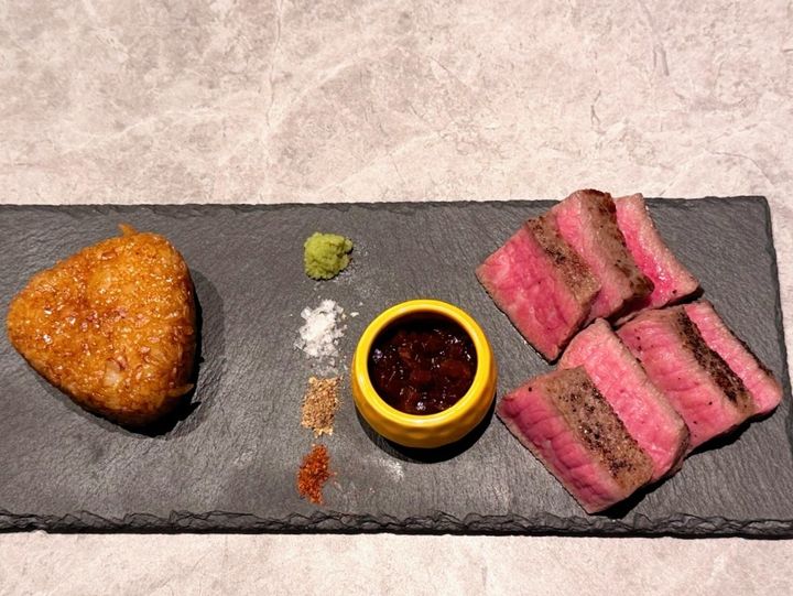 写真の「新宿ステーキセット100g」1980円は、ソースをおろしポン酢、オニオンソースなどから選び、ワサビや塩、山椒など好みの薬味で味わうステーキと、肉汁を染み込ませた焼きおにぎりがセットになったプレート。