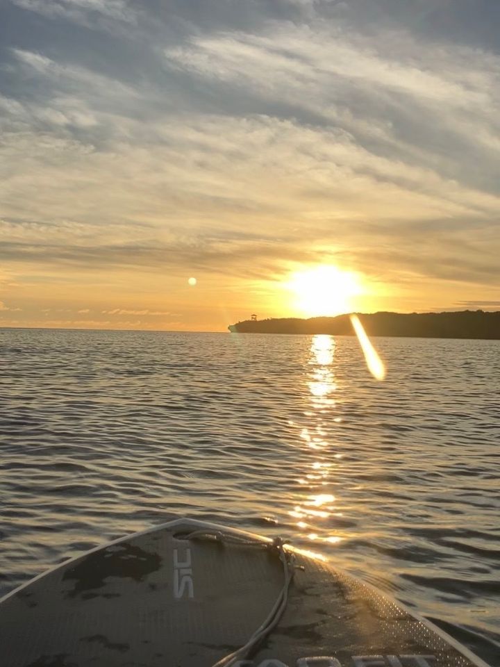 数少ない写真から一枚、SUP中に見た夕日。水平線近くが曇らないサンセットは、西表島でもそう多くはないそう。