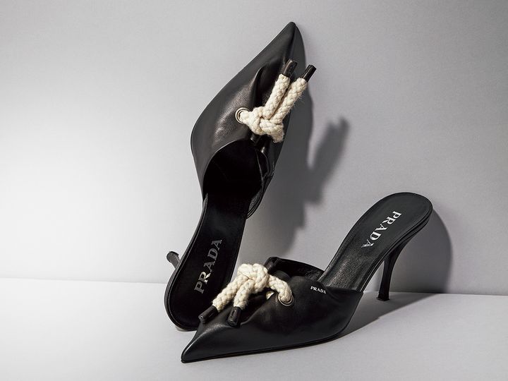 女らしいフォルムをモードに彩るロープ使いが素敵。足当たりのいい柔らかなレザーです。ミュール〈H8.5cm〉¥187,000※予定価格(プラダ/プラダ クライアントサービス)