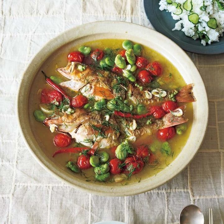 4. めばるに煮汁をまわしかけながら、8割ほど火が通るまで5~6分煮る。赤唐辛子、ミニトマト、実山椒を加え、ふたをして3分ほど煮る。そら豆を加えてひと煮し、器に盛ってディルを散らす。