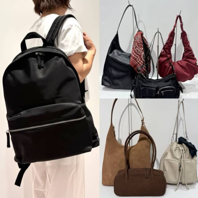 くしゅっとフォルムが可愛い「ダンプリングバッグ」や、秋らしい色味が揃う「ワイドボストンバッグ」も、シンプル服に取り入れるだけで即トレンド顔に。加えて、ポケット豊富で大人にも使いやすい「ナイロンツイルバックパック」は、通勤にも旅行にもおすすめです。