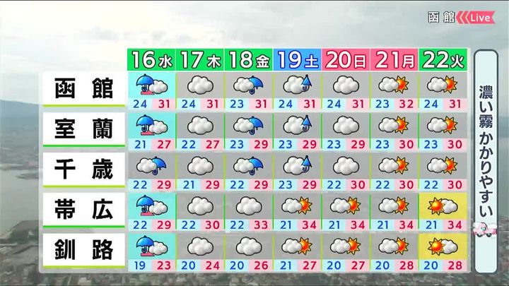 雲が広がり、霧がかかりやすいでしょう。金曜は道南で大雨のおそれがあります。3連休は道東で晴れるでしょう。厳しい蒸し暑さとなります。積極的に熱中症対策をしてください。