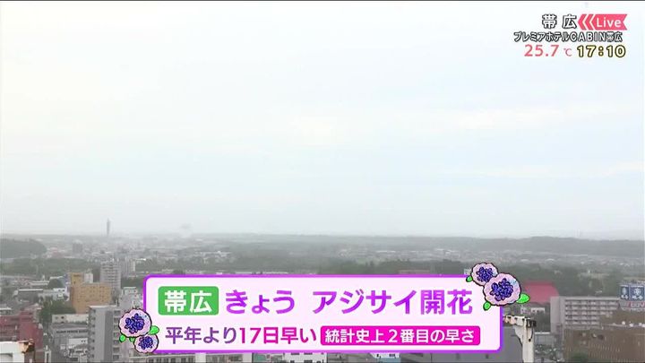 きょう15日(火)で今月8回目の真夏日になった帯広で、アジサイが開花しました。平年より17日も早く、統計史上2番目の早さでした。この先も平年より暑い日が続きます。