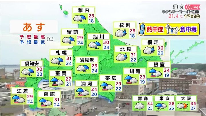 稚内ではきょう15日(火)夜は雨が強まり、ムシムシします。現在、稚内を含め道内広く食中毒警報が出ています。晩ご飯で残ったものは冷蔵庫に入れましょう。