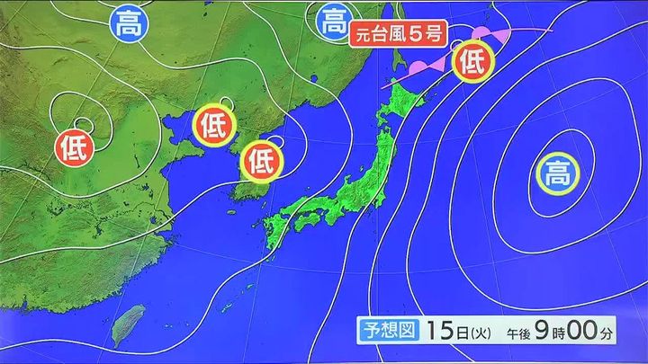 きょう15日(火)9時の予想です。台風から変わった低気圧は遠ざかりますが、低気圧からのびる前線が道北にかかります。また、西に低気圧、東に勢力の強い高気圧があります。低気圧付近は反時計回りに風が吹き、高気圧周辺は時計回りに風が吹くため…