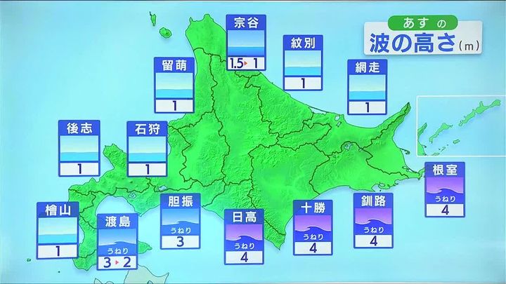 道内への上陸は9年ぶりでした。午前2時頃にえりも岬付近に上陸し、朝9時にはオホーツク海で温帯低気圧に変わりました。波浪警報は解除されましたが、あす16日(水)の波の予想も太平洋側でうねりを伴い、4メートルとしけるため、高波に注意して下さい。太平洋側のうねりはあさって木曜も残りそうです。