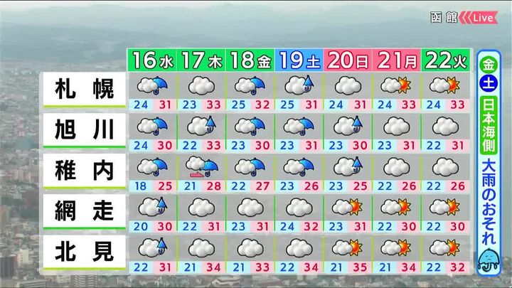 木曜は午後から道北で雨が降り出し、金曜と土曜は日本海側で大雨になるおそれがあります。最高気温は広く30度以上、朝も20度を下回らず、蒸し暑さが続きます。