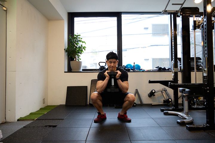 余裕が出てきたらダンベル(自宅ではペットボトルなどに代用可能)を持っておこなうと、より効果的!