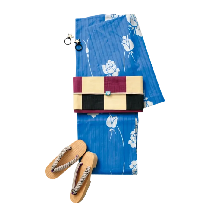 水色バラ柄浴衣 61,600円(反物価格)、帯締め、帯留め 各参考商品/以上竺仙 市松模様帯 11,000円、下駄 参考商品/ともに堀井 イヤリング 6,930円/アビステ