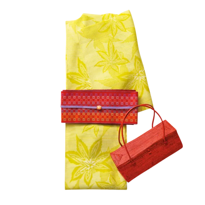 イエロー楓柄浴衣 137,500円(反物価格)、赤帯 50,600円、帯締め 参考商品/以上竺仙 かごバッグ 19,800円/ふりふ