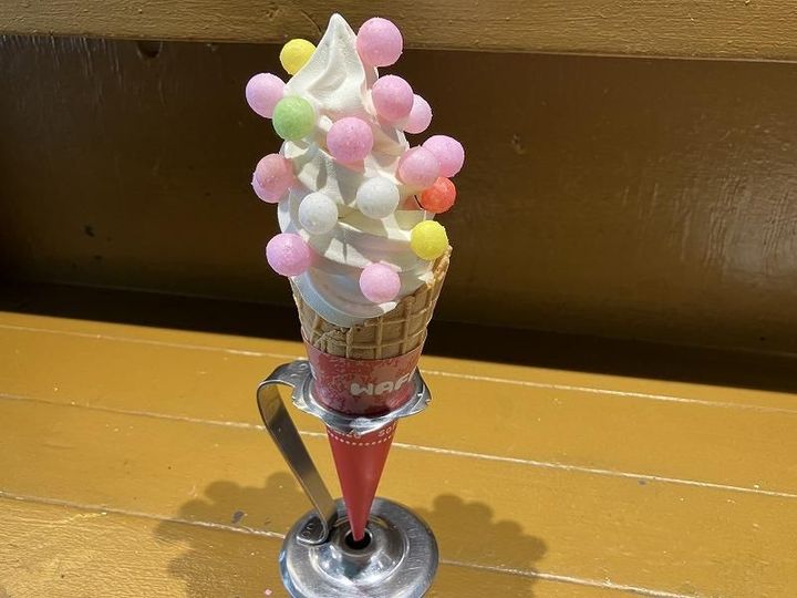 ソフトクリームにカラフルなおいりが散りばめられているのですが、この量!