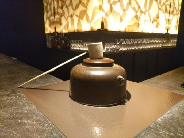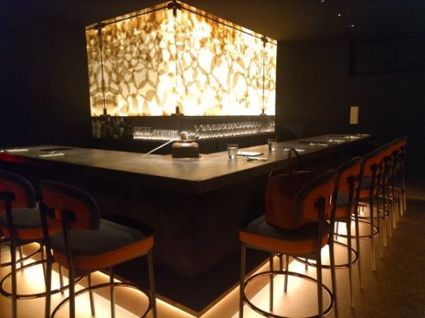 内装は、和紙作家によって貼り込まれた和紙貼りのカウンターがL字に広がり、行燈のような優しい光の中、障子を模したブロンズの光壁や茶釜が備えられ、特別な時間がより贅沢なひとときに変わる空間に。