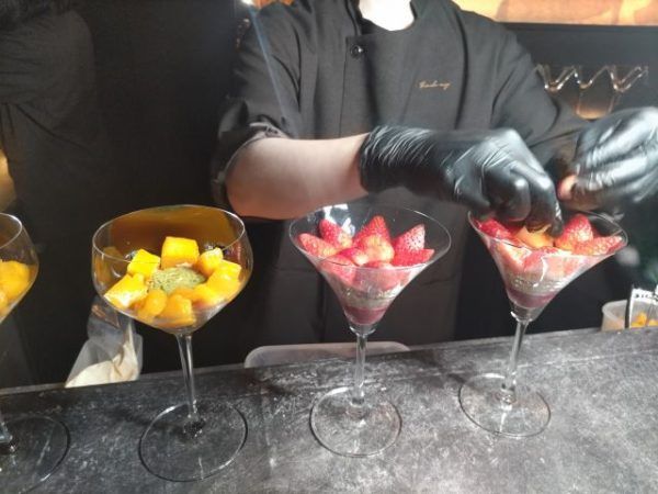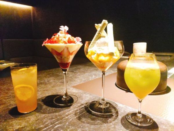 レセプションでは、「イチゴの花畑パフェ」と「日本茶とマンゴーのティラミスパフェ」の2種と、それぞれにペアリングされたドリンクをいただきました。