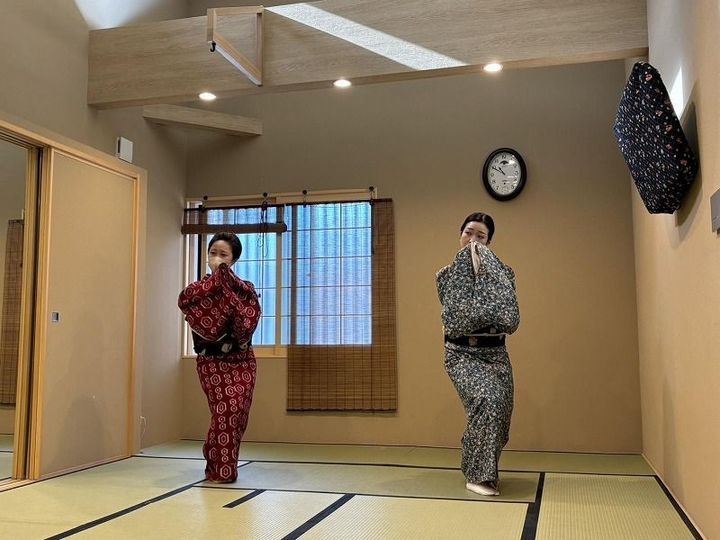 若柳流の踊りのお稽古風景。向かって左がふみ代ちゃん、右がこと代です