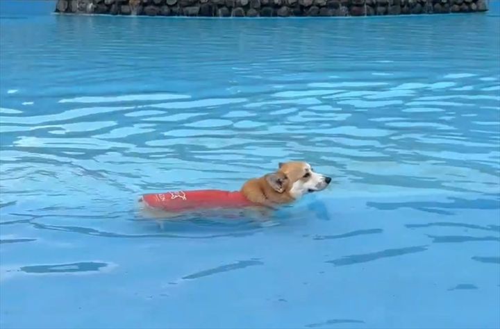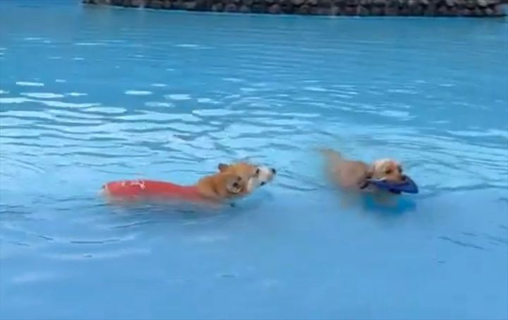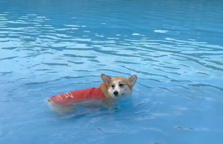 プールの中で必死に歩いてるのコーギー。 足を一生懸命動かしているのですが・・・、なぜか進んでいないように見えます!