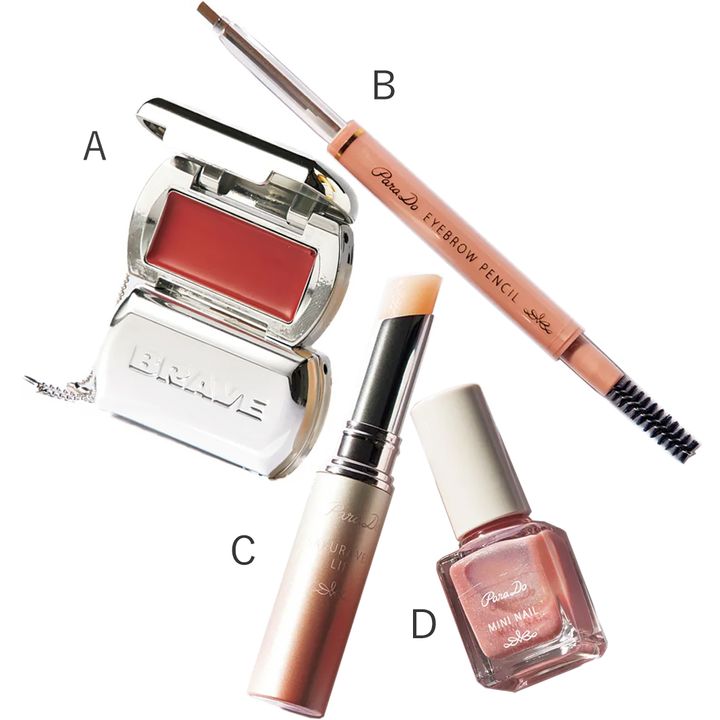 A、BRAYE リップスリーク ミニ 03 ¥1,210(フードコスメ) B、アイブロウペンシル N BR1 ¥770 C、サクラヴェールリップ PK01 ¥770 D、ミニネイルPK20 ¥385(すべてパラドゥ カスタマーセンター)