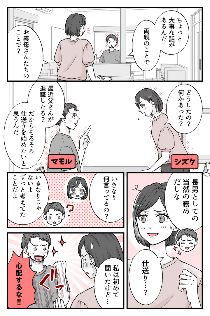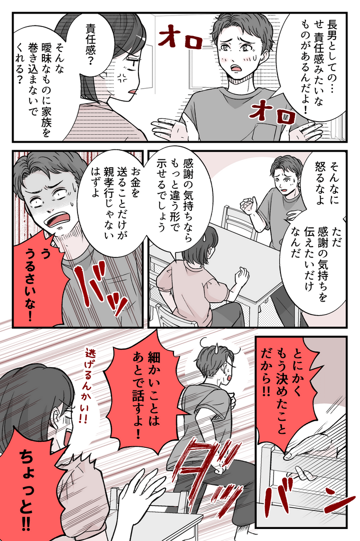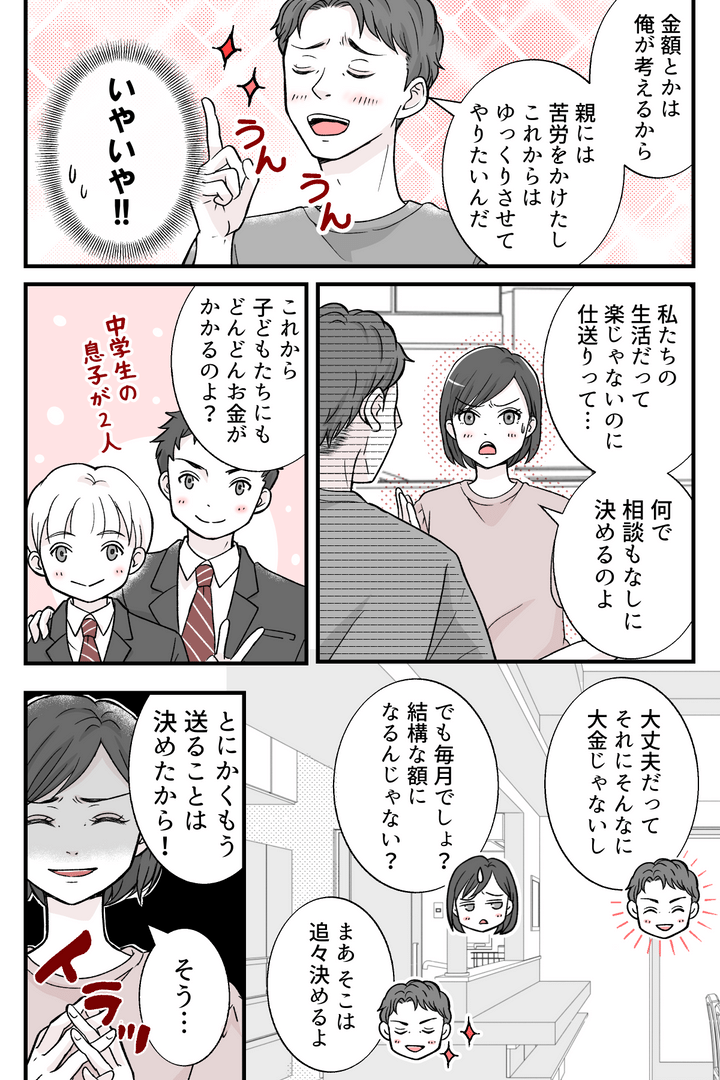 <義両親への仕送り8万!?>長男として当然の務め?気持ちよさそ~に語る夫にモヤッ【まんが】