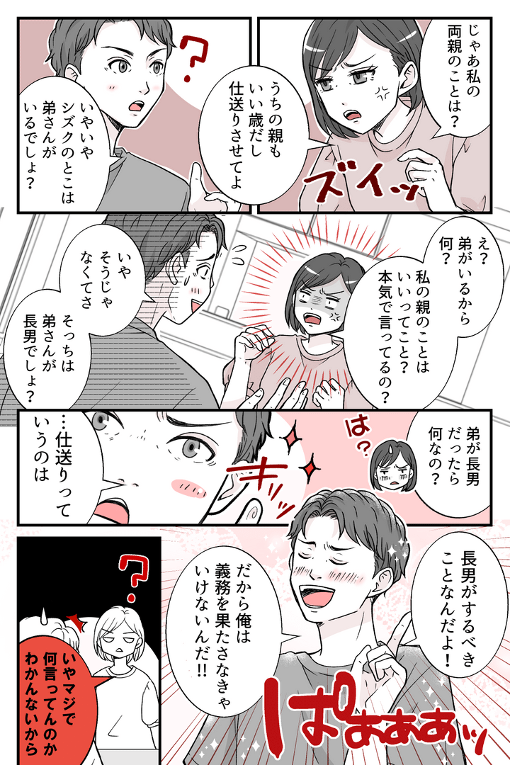 私は、マモルの言動に思わず眉をひそめてしまいました。マモルは私の賛同を得られると思っているのか、得意気に「長男だから」と語りだしました。さらには、私の両親については「弟が長男だから」という理由で一切の仕送りも考えていないようです。私はますます眉をひそめてしまうのでした。