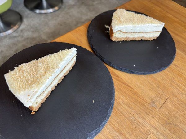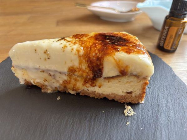 もう一種類のご紹介したいデザートが「燃えるチーズケーキ」です。 チーズケーキの王道はベイクドチーズケーキとレアチーズケーキですね。毎回ケーキ屋さんに行ったら迷いませんか? 私はどちらも好きなので毎回悩んでしまいます。魚米さんのチーズケーキはそのお悩みを解決してくれてベイクドチーズケーキとレアチーズケーキの2層になっています。