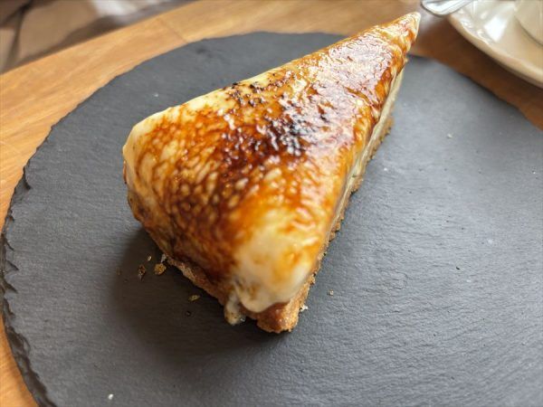 大きなお皿のうえのチーズケーキをスタッフさんがバーナーで炙ってくれます。チーズケーキの表面が溶けて固まるとパリパリのカラメル状になるのです。溶け出したチーズが至福。それを崩しながら食べます!