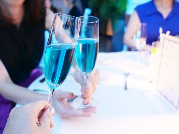 アルコール付きのプランを選ぶなら、乾杯はぜひ青いスパークリングワインで! 真夏であることを忘れてしまう瞬間です。