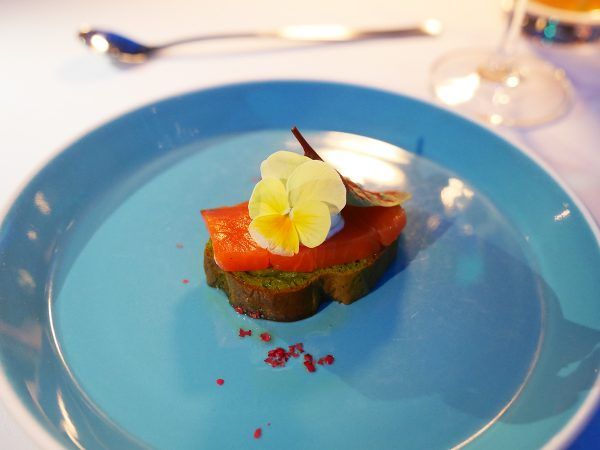 最初の一皿は、「サーモンマリネと萌黄色のケークサレ オニオンサワークリームと一緒に」。 厚みのあるサーモンマリネと、ほうれん草を練り込んだケークサレ、サワークリームが三位一体となって口の中に広がる、夏らしい逸品です。