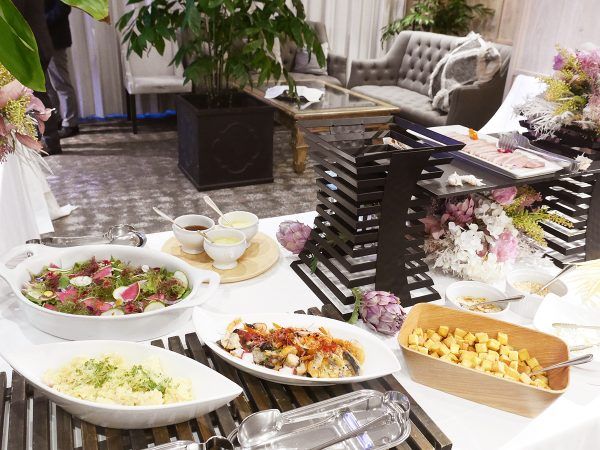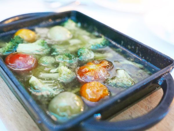 テーブルに運ばれてくるお料理に加え、夏の地場野菜と海藻サラダがリトルブッフェスタイルで提供されます。 ミニトマトのカプレーゼ、自家製ポテトサラダ、鰆と芝海老のエスカベッシュ、合鴨炙り焼き、グリーンサラダなど量も種類も豊富。 アーモンドスライスやヘーゼルナッツ、パンプキンクルトン、ラスパドゥーラチーズといったトッピングや3種類のドレッシングで味の変化も楽しめるようになっています。 食べたい量は人それぞれ違うので、リトルブッフェで調整できるのはありがたいですね。