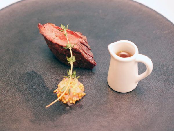 メインディッシュは、「牛カイノミのグリリアータ(グリル)」です。 しっとりやわらかく、焼き加減もベスト! 甘酢生姜とマスタードシードのコンディメントと黒胡椒のソースとの相性も抜群でした。
