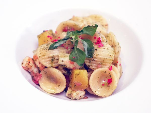 パスタは「オレキエッテ 海老と青紫蘇のジェノベーゼ 」。 提供されたあと、目の前でたっぷりのペコリーノ・ロマーノチーズを削っていただいて完成します。