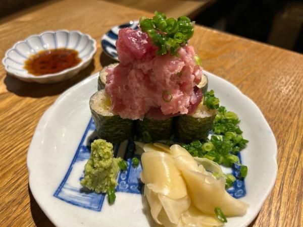刻みたくあんを巻いた巻寿司の上にたっぷりのトロが。わさびが中にも入っていて、わさび好きの私にはぴったり!