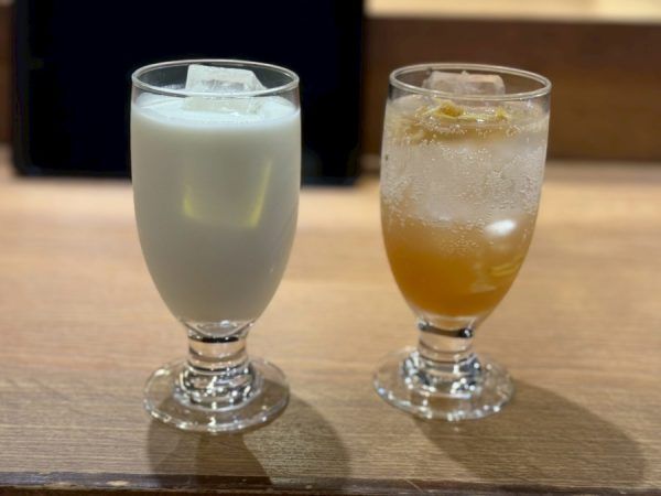 左:自家製ヨーグルトを使用した濃厚ラッシー、右:生姜ピールたっぷりの自家製ジンジャーエール。スパイスカレーにぴったりの“主役級”ドリンク。