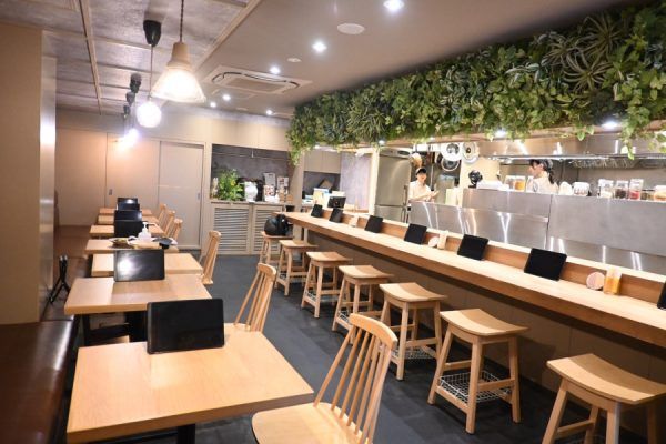 落ち着いたトーンとグリーンが印象的な店内。テーブル毎の間隔も広く、“整う”時間を味わう空間づくりにも、夢民のこだわりが光る。