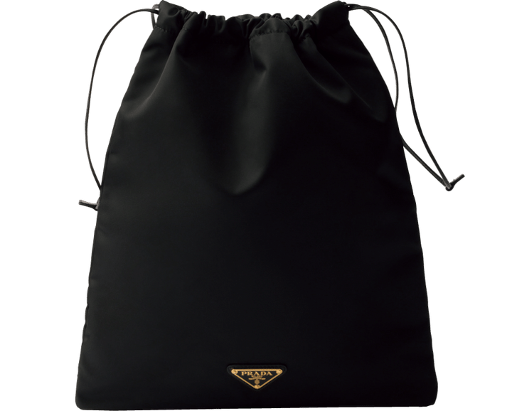 トライアングルロゴがきいたシンプルな巾着ポーチは、とにかく汎用性の高さがピカイチ。高級感のあるレザーストリング、内ポケット付きとさり気ない気配りも嬉しいポイント。海洋プラスティックなどをリサイクルして作られたRe-Nylonを使用。