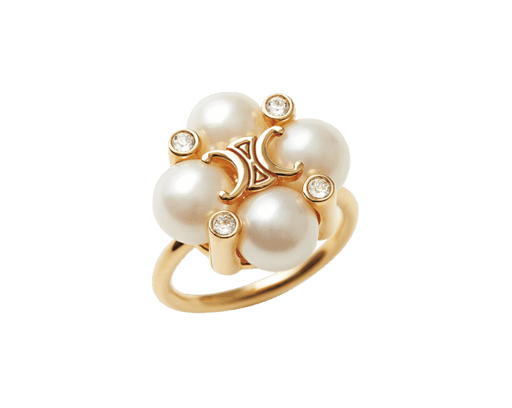 トリオンフを中心に、レジンパールとストラスをシンメトリーに配したエレガントなリング。ドレススタイルにはもちろん、デニムやサマードレスなど、あえてカジュアルでデイリーな装いに合わせても素敵。セリーヌらしいエレガントさが魅力。