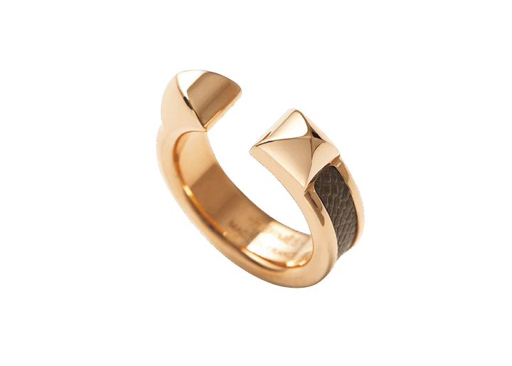 ゴールドメタルとレザーを組み合わせたダブルスタッズのリング。シンプルながら洗練されたデザインは、他のリングとの重ね着けはもちろん、1本でも十分な存在感を放つ。ブラックのレザーはシックでモダンなムードが好きな人に。