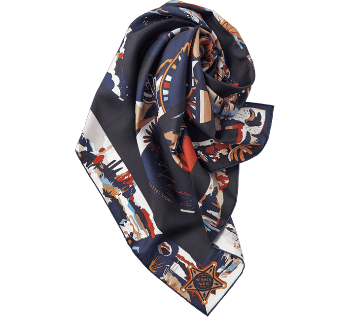 カウボーイブーツをモチーフに描いた大判のカレ。さまざまな色を使用しながらもブラックベースだからどんなスタイルにもスッとなじむ1枚。首元にサッと巻いたり、頭にキュッと結んだり、バッグにあしらったりと使い方は無限!