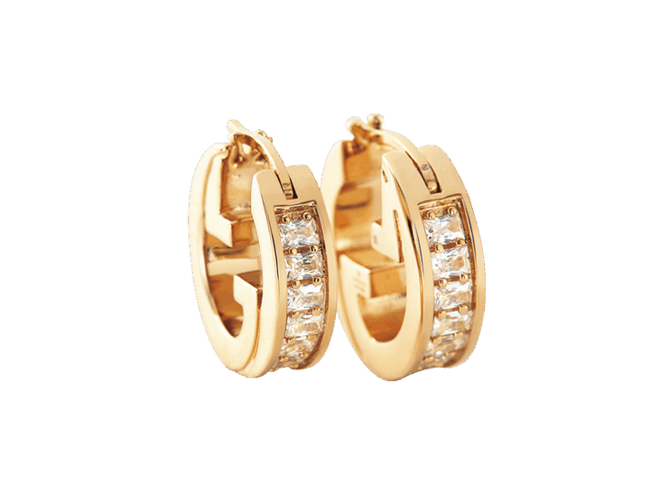 サイドから見るとGマークを重ねたデザイン、ラウンド インターロッキングGがポイントのフープピアス。キラキラと煌めくクリスタルとゴールドメタルのGマークが顔まわりを豪華に彩る。デイリーユースしやすい小ぶりなサイズ感も◎。